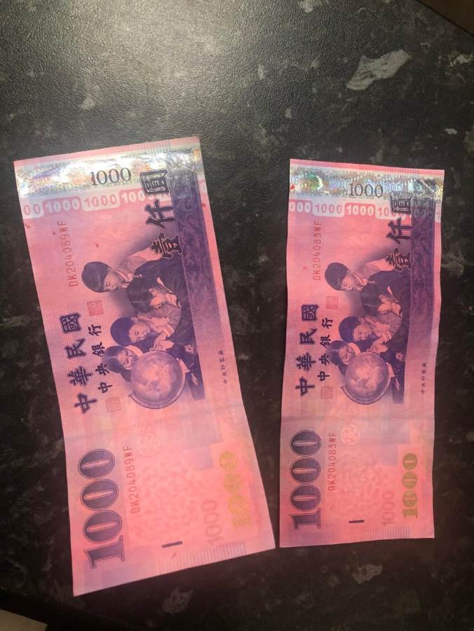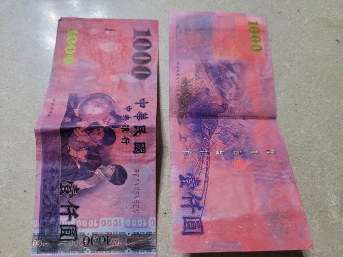 這兩張千元鈔整體呈現淡淡的粉紅色,外觀與一般鈔票相比顯得格外突兀。不過,鈔票上的銀色防偽條仍完整無損,看起來並未遭到破壞,唯獨下方一排「1000」字樣被染上不尋常的色彩。