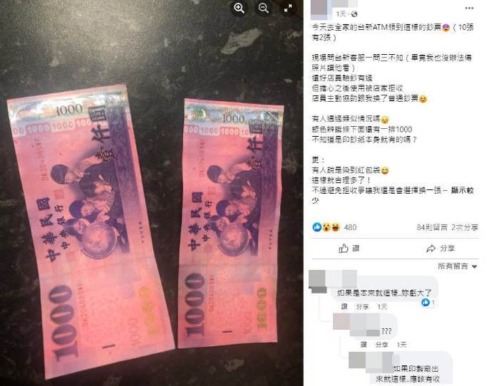 帶著疑惑和不安,這位女網友決定找便利商店的店員幫忙驗鈔。幸運的是,經過店員仔細檢查,確認這兩張粉紅色的鈔票是真鈔。