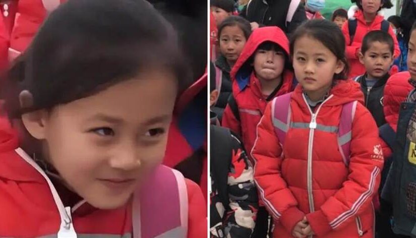 小女孩叫鐵嘉欣,影片中的她穿著一件普通的紅色棉服、牛仔褲和黑白配色的鞋子。