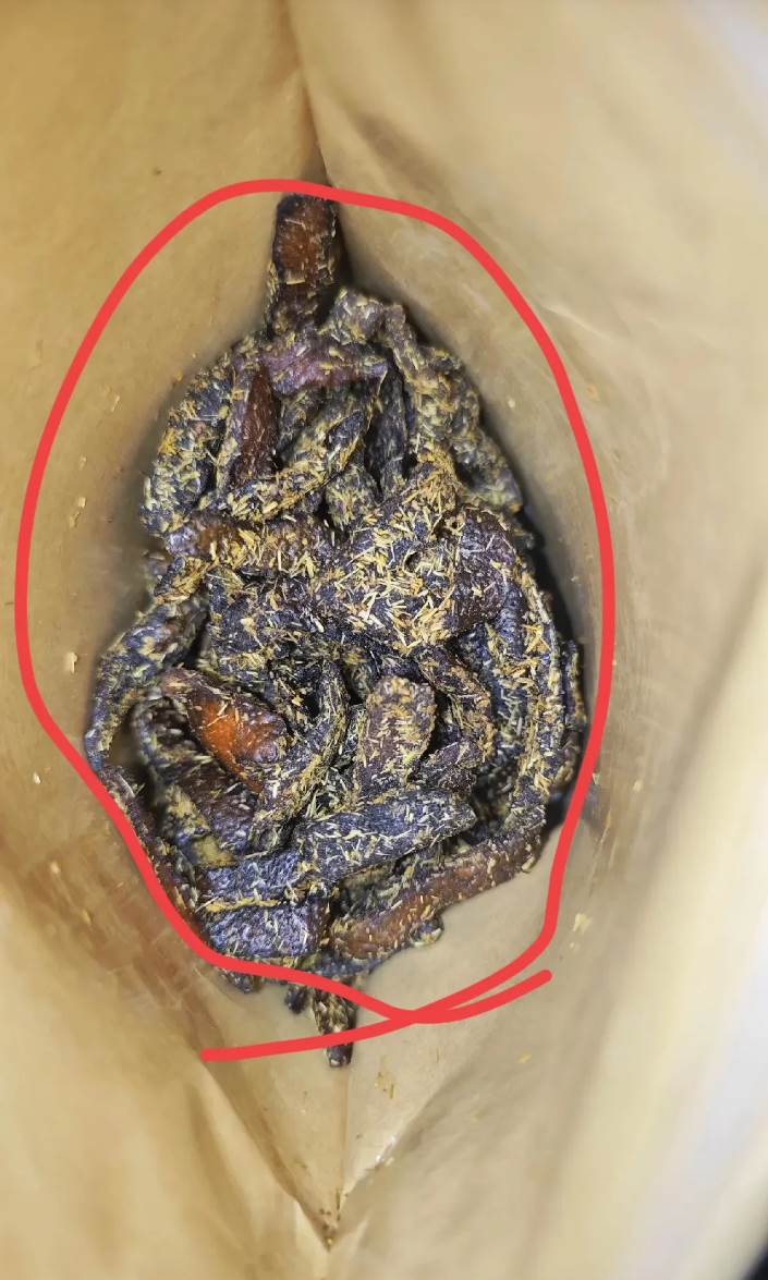 盒子裡裝著深褐色、看起來黏糊糊的片狀物,上面還撒滿了紅色粉末,看起來像是發霉了似的。第一反應是:這食物變質了吧?同事是不是把放壞的東西送給我了?