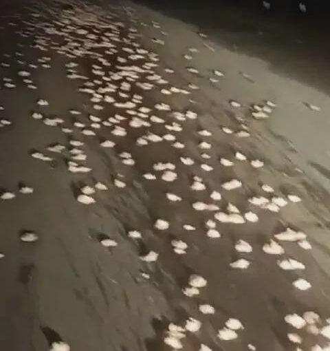 日,一名男子深夜開車與朋友外出時,看到路面上散落一大片白色「小石頭」下車一看,險些被嚇破膽,竟是滿地的雞屁股,密密麻麻十分的詭異!