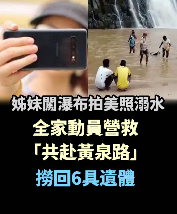 近日,印度一個七口之家前往當地的瀑布景區旅遊,沒想到在靠近瀑布區自拍時,兩姊妹不慎失足墜入深水潭,並被困在水中無法自救。其他家族成員發現後,立刻集體跳入水中進行搜救,結果也被強勁水流捲走,最終造成六人溺水身亡。