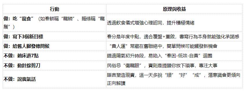 這一天不僅是天文意義上的春分(22:46正式交節),也恰逢農曆二月初二「龍抬頭」,角宿升空與晝夜平分相逢,陽氣升騰、天地同春,民間稱之為「火龍入春」「雙福臨門」 。這種重合約60年一遇,上一次在2000年,下一次要到2084年 ,因此被賦予極強的象徵意義——它像一個天然的心理開關,提醒人們:‌這是重啟節奏、調整方向的好時機‌。